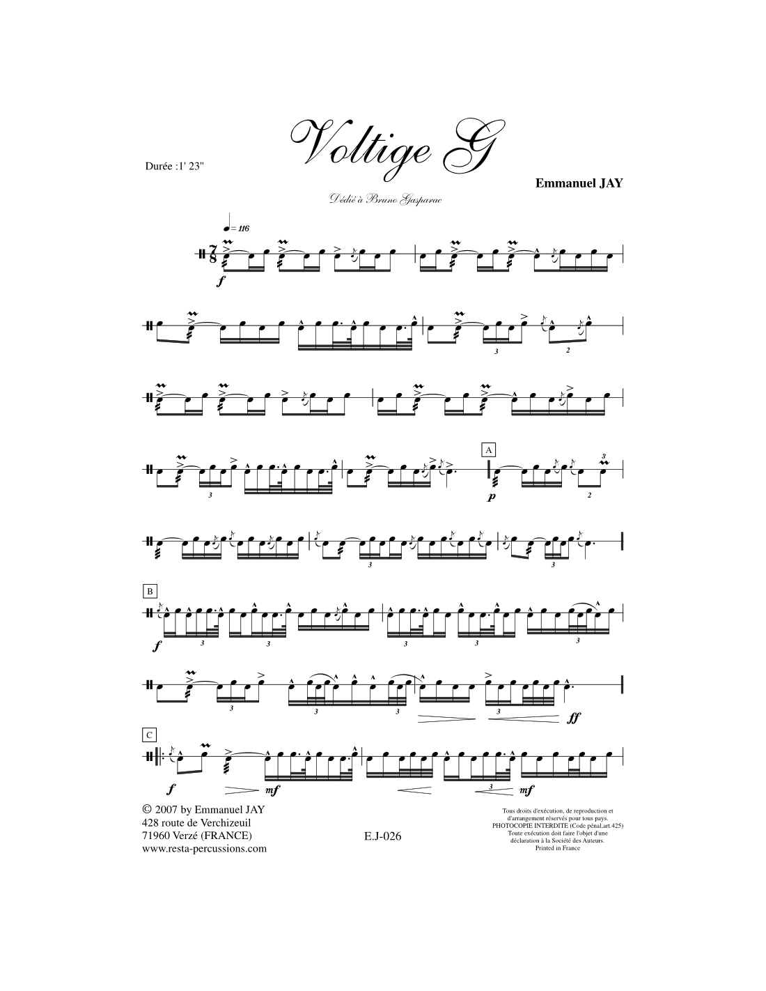 Dédiée à Bruno Gasparac, pour son amour des mesures irrégulières, cette pièce en 7/8 contient des mesures que l’on peut diviser en croches sous la forme 2 + 2 + 3. Le phrasé et le swing de ce morceau dépendent d’ailleurs de la capacité de l’exécutant à faire « sonner » cette division rythmique.