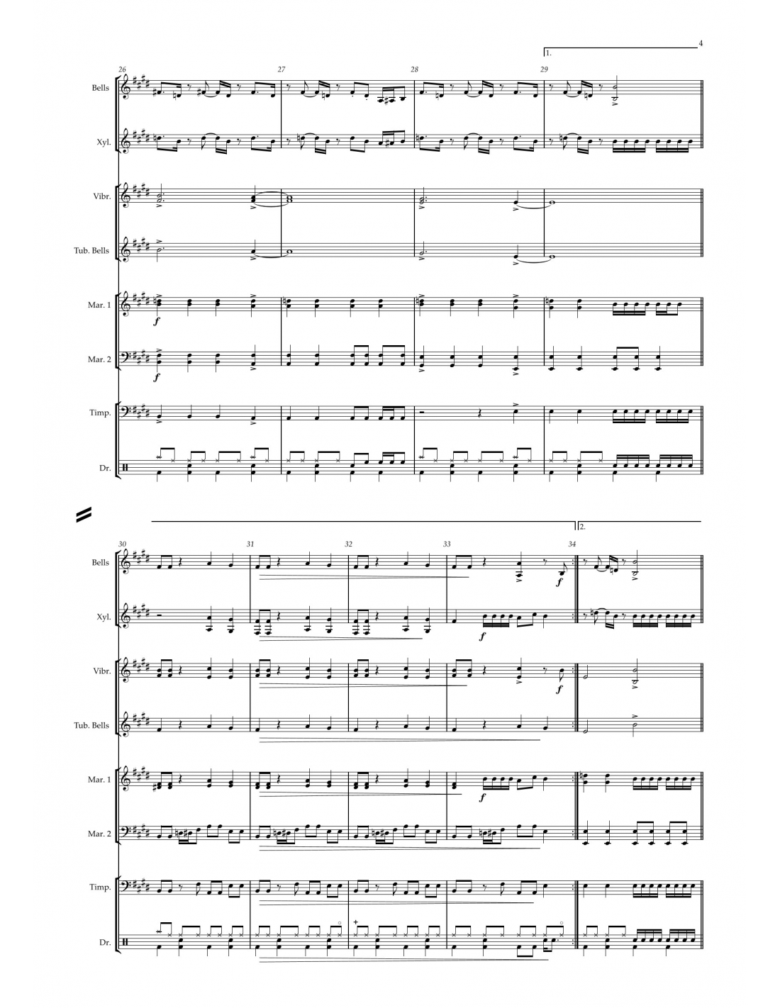 Pour 6 à 8 percussionnistes : Glockenspiel, xylophone, vibraphone, cloches tubulaires (optionnel), marimba 5 octaves (les deux parties de marimba peuvent être jouées sur un seul instrument), 4 timbales, batterie.