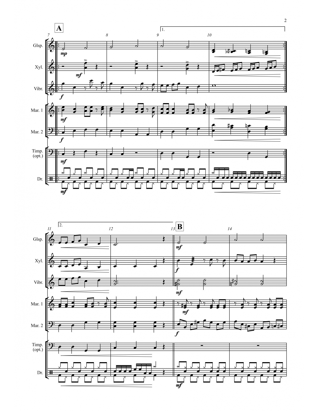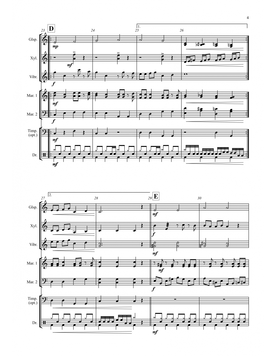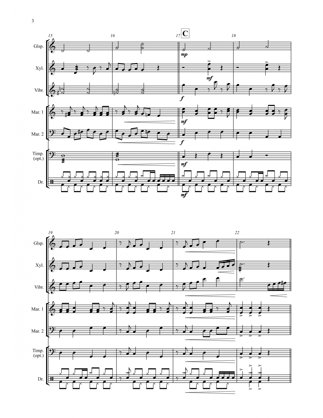 Pour glockenspiel, xylophone, vibraphone, deux parties de marimba pouvant être jouées sur un seul marimba 4-1/3 oct., partie optionnelle pour 4 timbales, batterie.