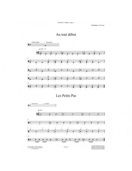 Les pièces sont parfois écrites sur une portée, parfois sur de simples lignes, avec des dispositions imposées ;Tricotis : les graves à gauche Batterie : les graves à droite. Des contraintes et des habitudes de lectures souvent rencontrées dans le métier de percussionniste. Ajouter autour de la caisse claire, un tom, une cymbale, un wood-block ; prendre conscience de l’espace, se l’approprier ; et toujours s’amuser à jouer ; tel est le but de ces recueils de pièces courtes et ludiques. Le premier cahier (cycle 1) contient aussi sept exercices « Doubles Sons », qui peuvent être joués sur n’importe quel instrument à peau ou autre idiophone. La disposition est libre : le grave à gauche ou à droite ; deux instruments en ligne. Le tempo est indicatif et fonction de l’habilité du jeune musicien. Tout est laissé à la libre disposition du professeur. Le premier cahier s’adresse aux élèves de première année de cycle 1. Le second peut couvrir les deuxième et troisième années. Collection “Azurythm”, dirigée par Régis Famelart.